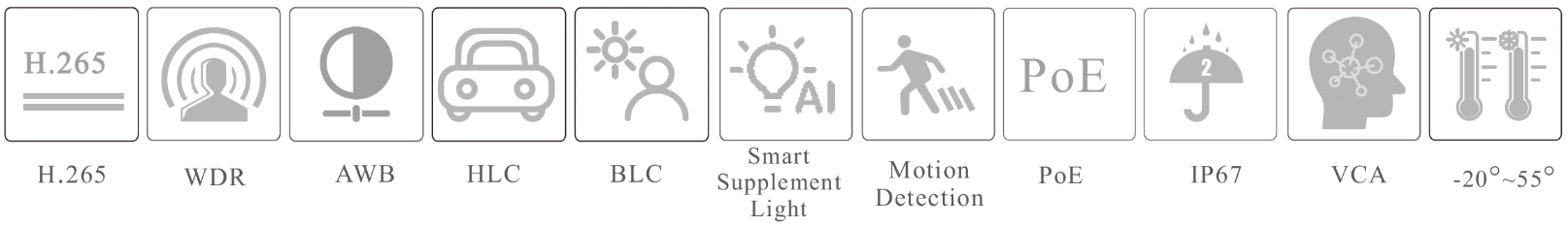 • 3D DNR, WDR, HLC, BLC, etc.